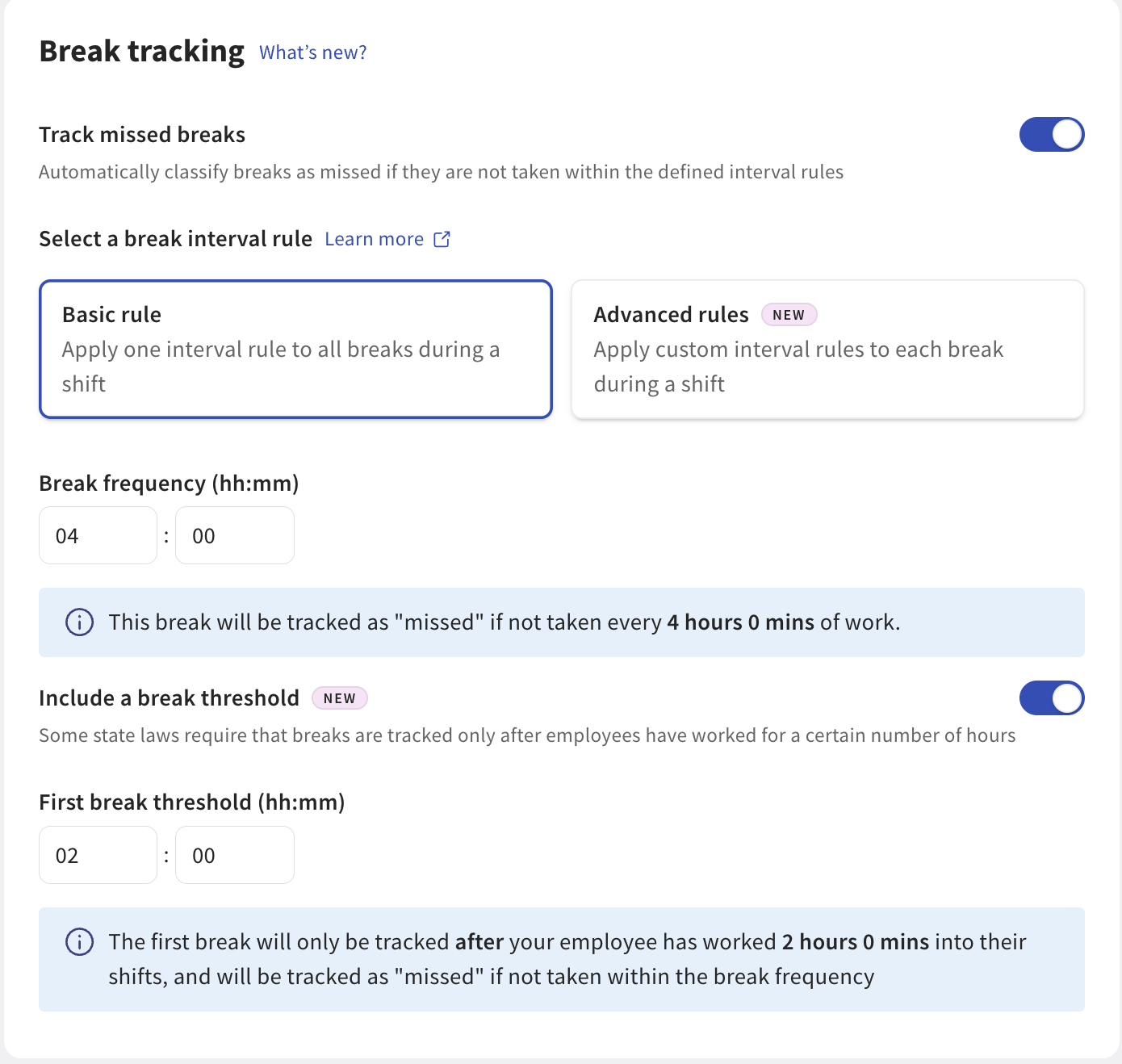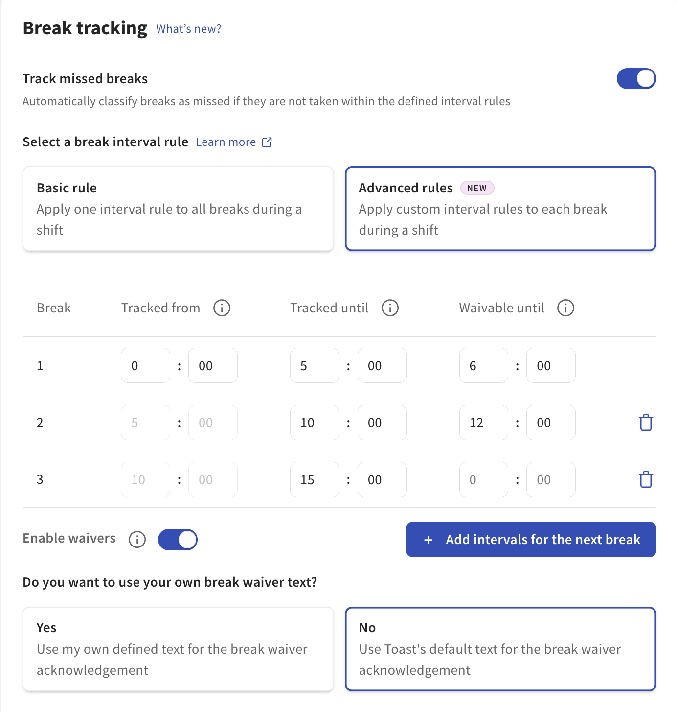 Advanced rules: custom intervals for each eligible break based on time worked or prior breaks.