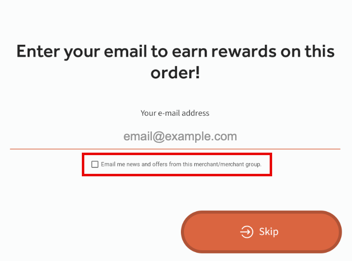 Your guests that use Toast kiosk devices can now choose to opt in or opt out of email marketing when they provide their email address with a new checkbox. If the guest checks the box, they are subscribed to email marketing. If they leave it unchecked, their email marketing status remains unchanged. The new checkbox appears when you first enter your email to check in for an order, and on the Would you like a receipt? screen.