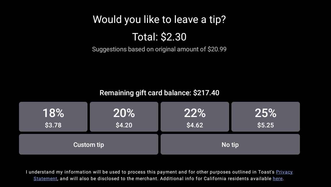 Tip suggestions now consistently calculate based on the original check total when guests pay using multiple gift cards. Previously, if a guest used more than one gift card, the tip suggestion was incorrectly calculated based on the remaining balance of the final payment rather than the full order amount. This update ensures guests see accurate tip suggestions regardless of how many gift cards are applied to a single check.